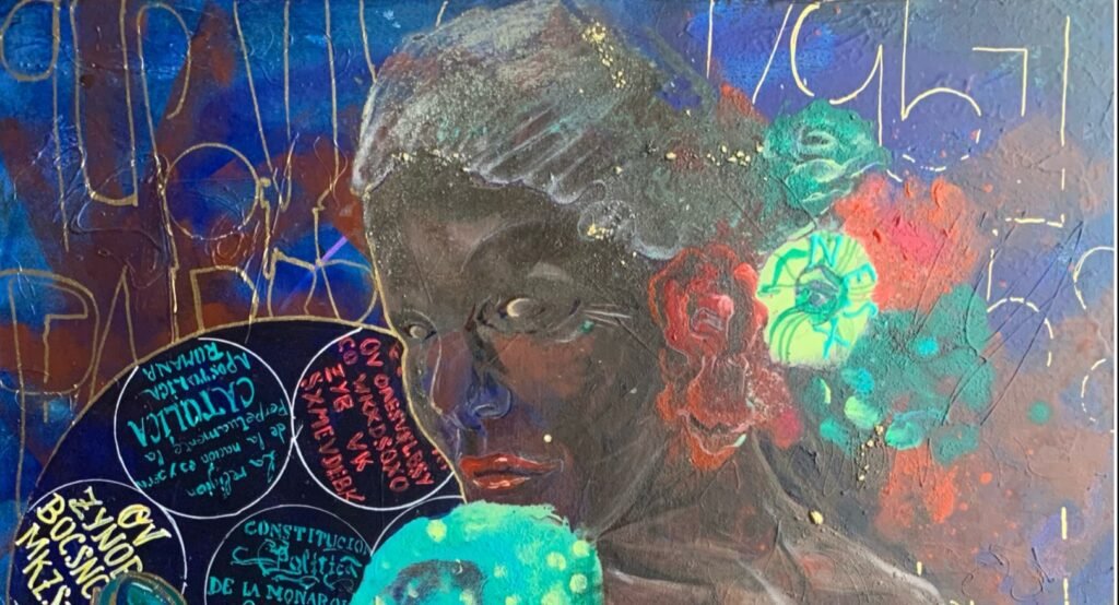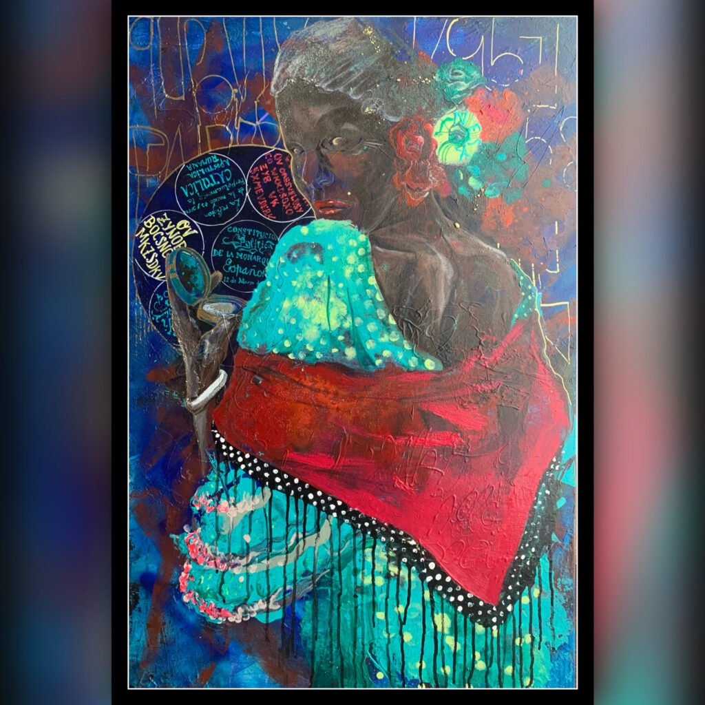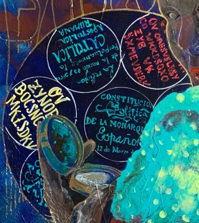 Que viva la Pepa nos habla sobre un episodio de la historia de España, y es que en torno a 1812 cuando el ejercito Francés ocupaba la península ibérica, un grupo de revolucionarios imprimieron a escondidas lo que acabaría siendo la primera carta magna de derechos y libertades de España, la constitución de la Pepa. Para poder llevara cabo semejante tarea, un grupo de mujeres gaditanas imprimieron los primeros borradores de la constitución en miniatura y los escondieron en sus polveras para poder sortear los controles del ejercito francés, pudiendo así diseminar las copias por toda la península informando a la población de lo que se acababa de crear. Estas mujeres se jugaron su vida y su libertad, y en esta obra podemos ver a una de esas mujeres anónimas portando una polvera y una copia de la Pepa en un fondo azulado, su vestido de época y su recogido con flores en el pelo nos recuerdan a aquella época de la Historia de España. Una historia digna de ser recordada.